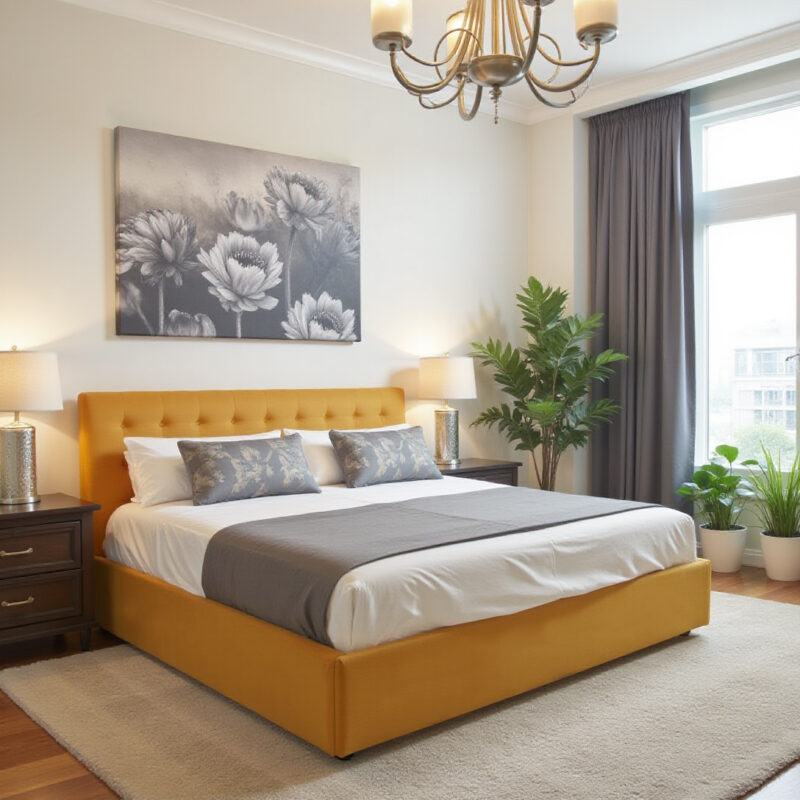 The Karl Mosen upholstered bed 160×200 cm with folding bed base, storage box and mattress – mustard color gives the bedroom an aristocratic touch of elegance, style and practicality. The bed has a modern design , created by our experts according to the latest trends in interior design. Finished with care and attention to detail, the bed offers practical, generous and easily accessible storage space . Because our bedroom is more than just a place to sleep, the Karl Mosen double bed is very comfortable and spacious .
